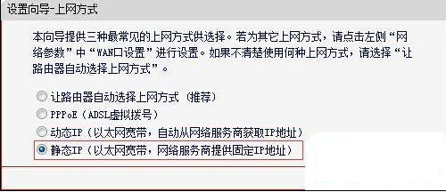 静态IP上网设置:选择“静态IP(以太网宽带,网络服务商提供固定IP地址)”——>点击“下一步”。